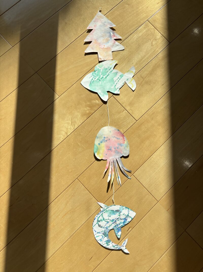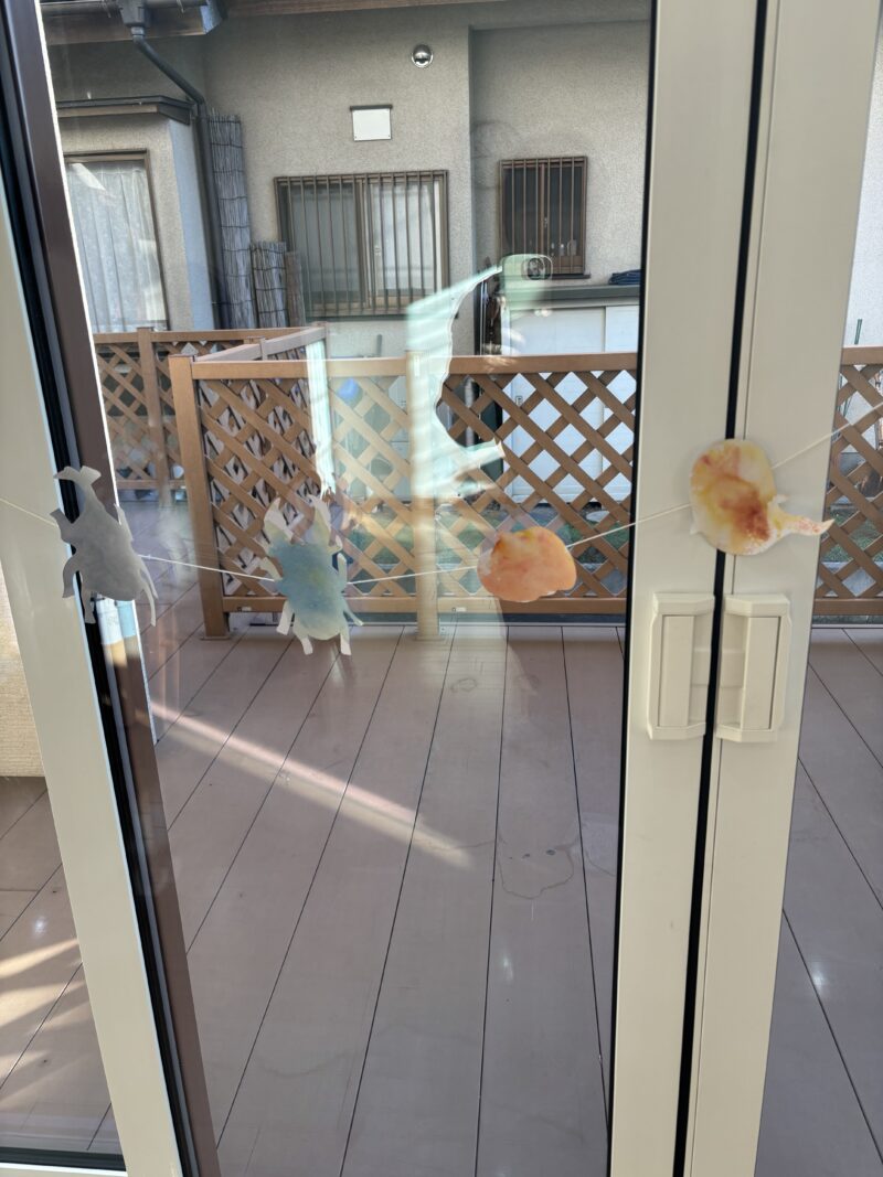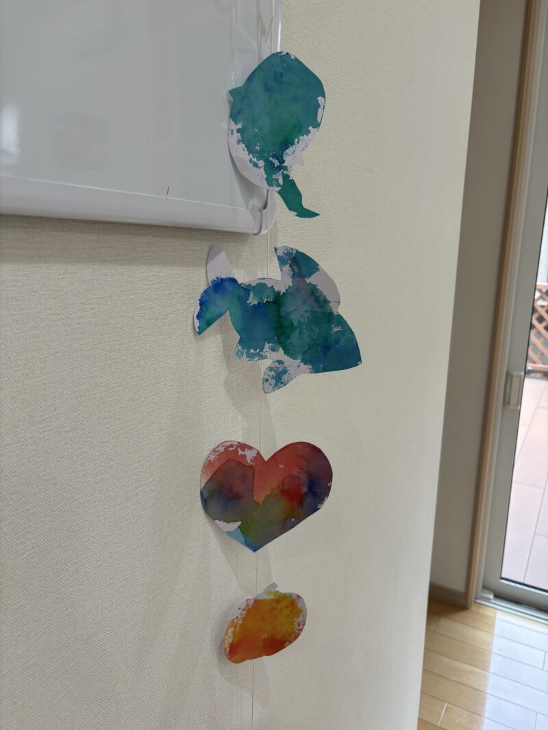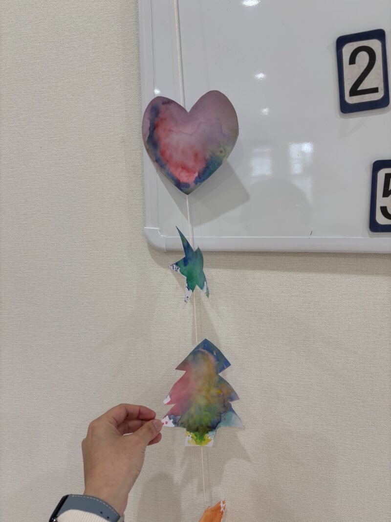 その後、画用紙の裏にバランスを見ながらタコ糸を貼って、ガーランドの完成です。