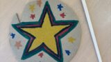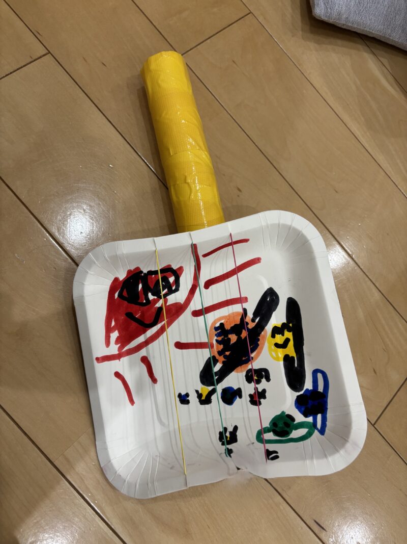 自分の好きな絵をボディに描いて、輪ゴムの弦を張ったら、ネックをつけて出来上がり。