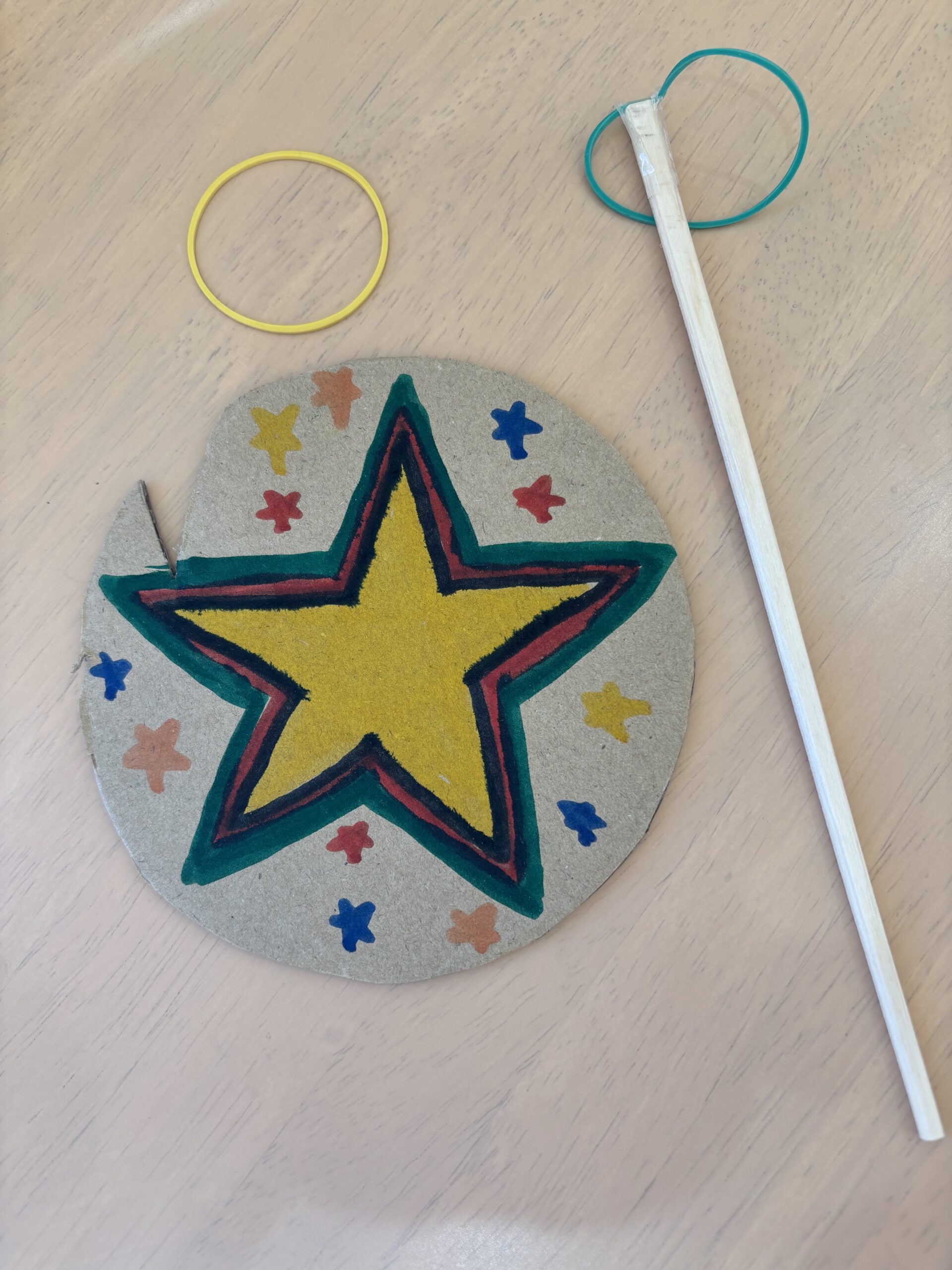 段ボールに絵を描いて、輪ゴムを使って飛ばすのですが